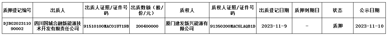 海南國城常青投資合伙企業(yè)(有限合伙)(企業(yè)代碼:993906)合伙人“四川國城合融新能源技術(shù)開發(fā)有限責(zé)任公司”于2023年11月9日在我中心辦理了財產(chǎn)份額質(zhì)押登記業(yè)務(wù),具體情況如下: