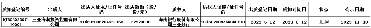 海南海潤珍珠股份有限公司(企業(yè)代碼:993883)股東三亞海潤投資控股有限公司于2023年7月11日在我中心辦理了股權質押登記業(yè)務,具體情況如下:
