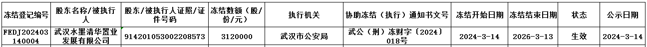 依據(jù)武漢市公安局《協(xié)助凍結(jié)財產(chǎn)通知書》[武公(刑)凍財字〔2024〕018號]文件,我中心為海南白沙長江村鎮(zhèn)銀行股份有限公司(企業(yè)代碼:893522)股東武漢水墨清華置業(yè)發(fā)展有限公司辦理股權(quán)凍結(jié)登記,具體情況如下: